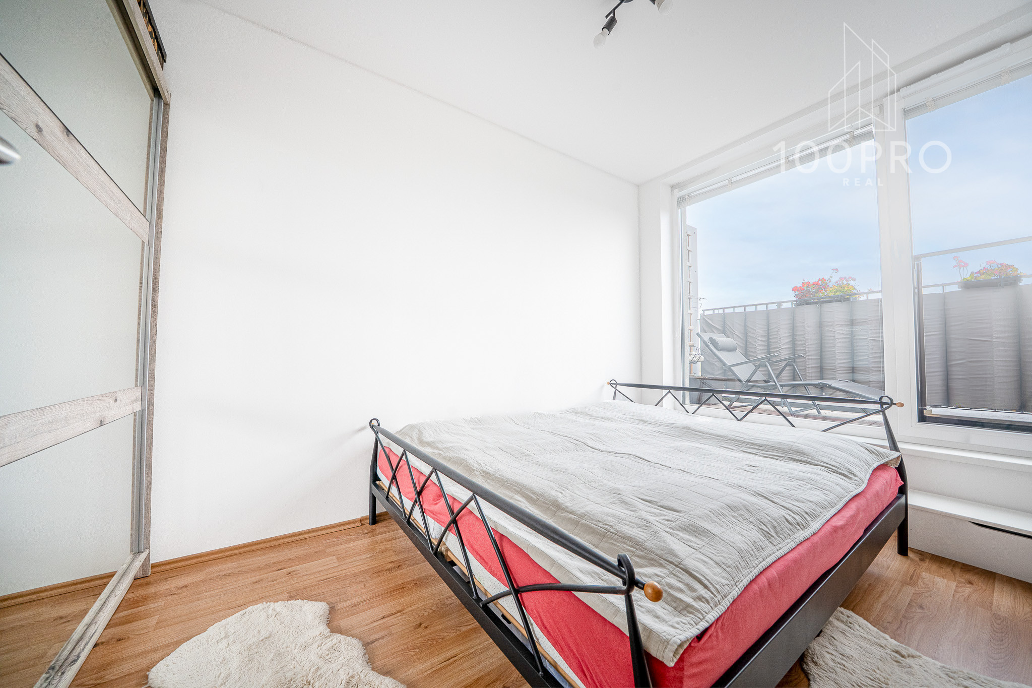 Interiér bytu pôsobí svetlo, čisto a vzdušne. Dispozícia je premyslená – obývacia izba s výstupom na terasu plynulo nadväzuje na kuchynský kút, spálňa je oddelená a poskytuje dostatok súkromia.